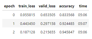 After picking a learning rate, we freeze all layers of neural net except the last one, and train 3 epochs. The last layer is created specifically for our task of classifying 400 bird species and is how we can do transfer learning. Result of training 3 epochs: