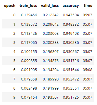 Wow! We already reached 94.5% accuracy on validation set. We can push it further by unfreezing all layers and training it more. This time, we use discriminative learning rate which gradually increases learning rates for later layers, because later layers recognize more complex pattern in images.